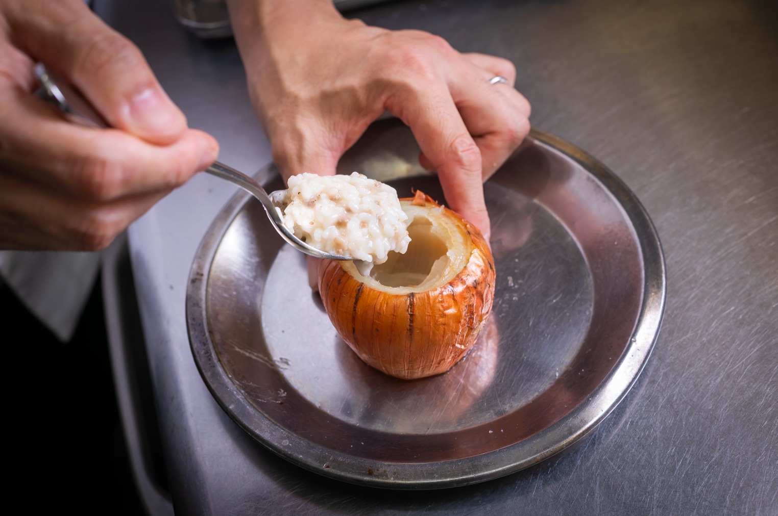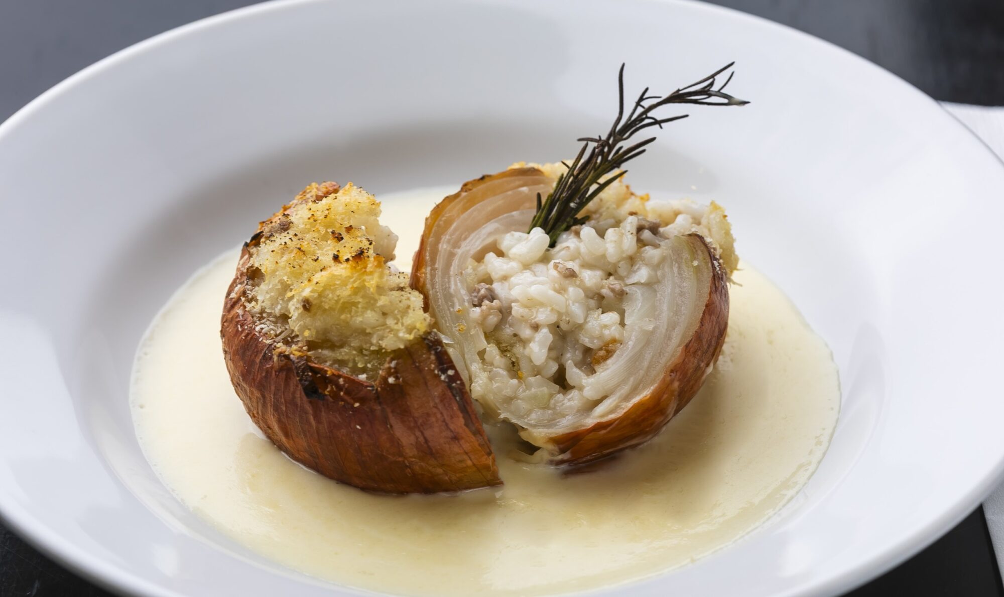 Uniquely crafted risotto of pre-cooked rice flavored simply with cheese and sausage stuffed in a slow-roasted onion bowl.