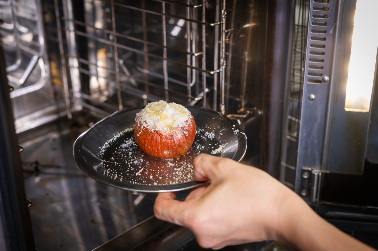 オーブンでじっくり焼いた玉ねぎの器に、チーズやソーセージで簡単に味付けしたパックごはんを、詰め込んだオリジナルリゾットです。