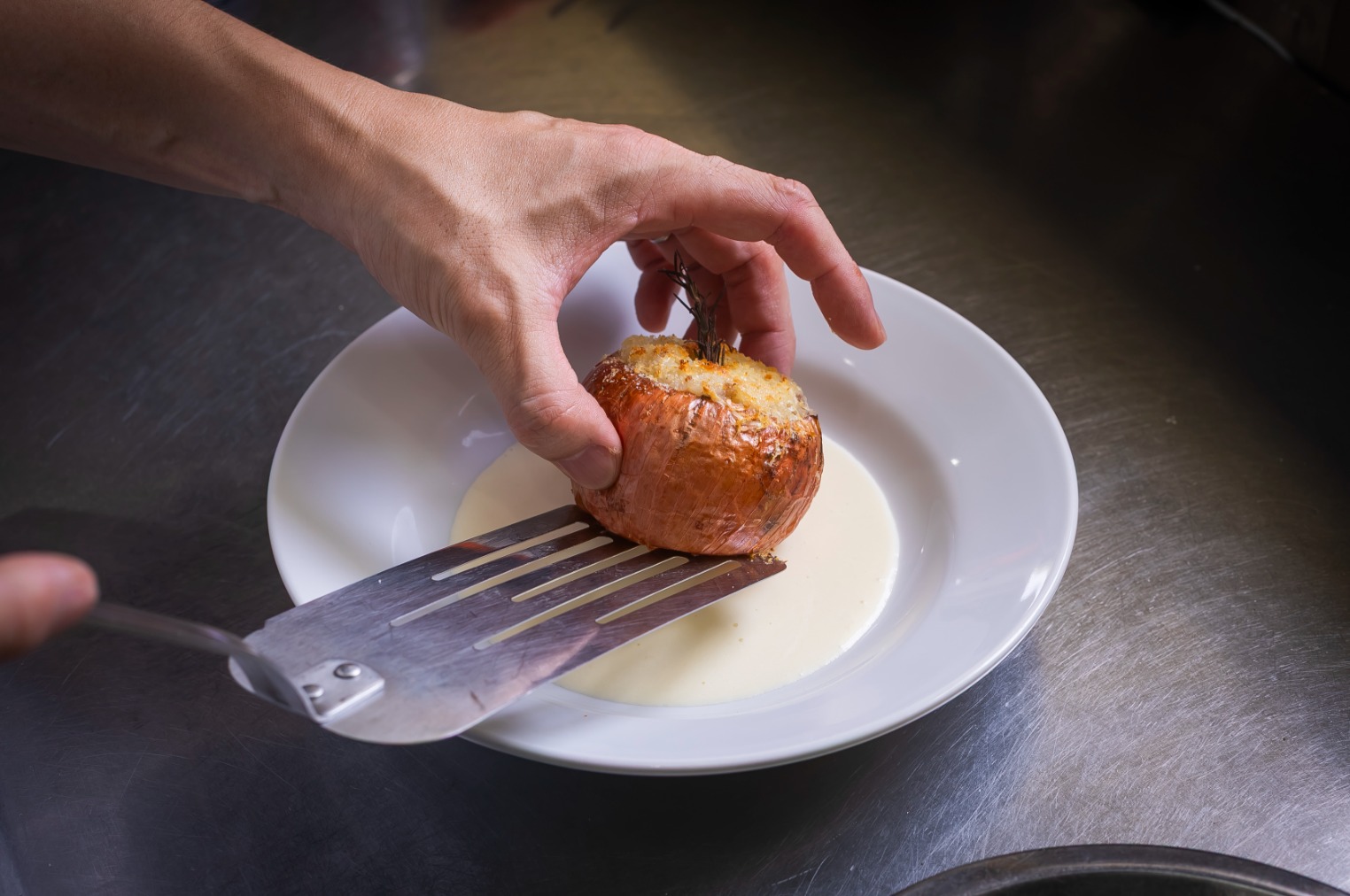 Pour the sauce on the plate and then place the cooked onion on top.