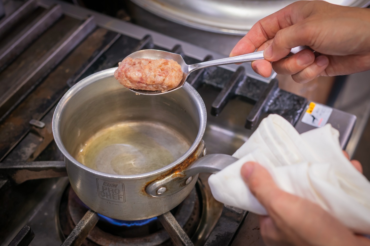 When it has browned, pour in the white wine in a circle, and scrape off the savory bits stuck to the bottom of the pot.
