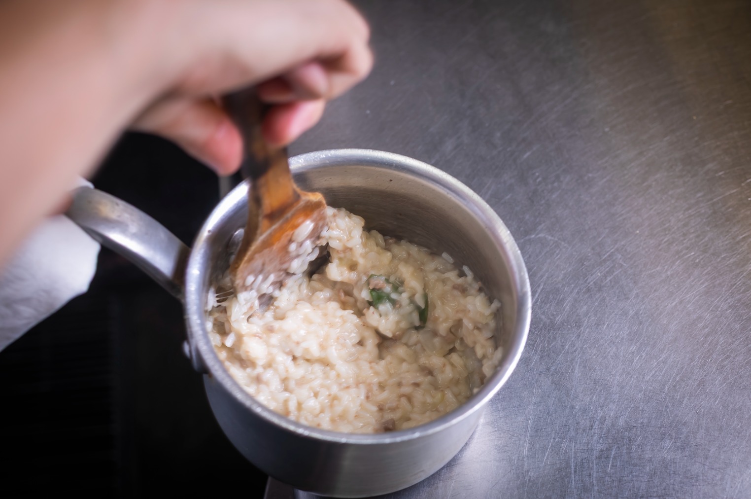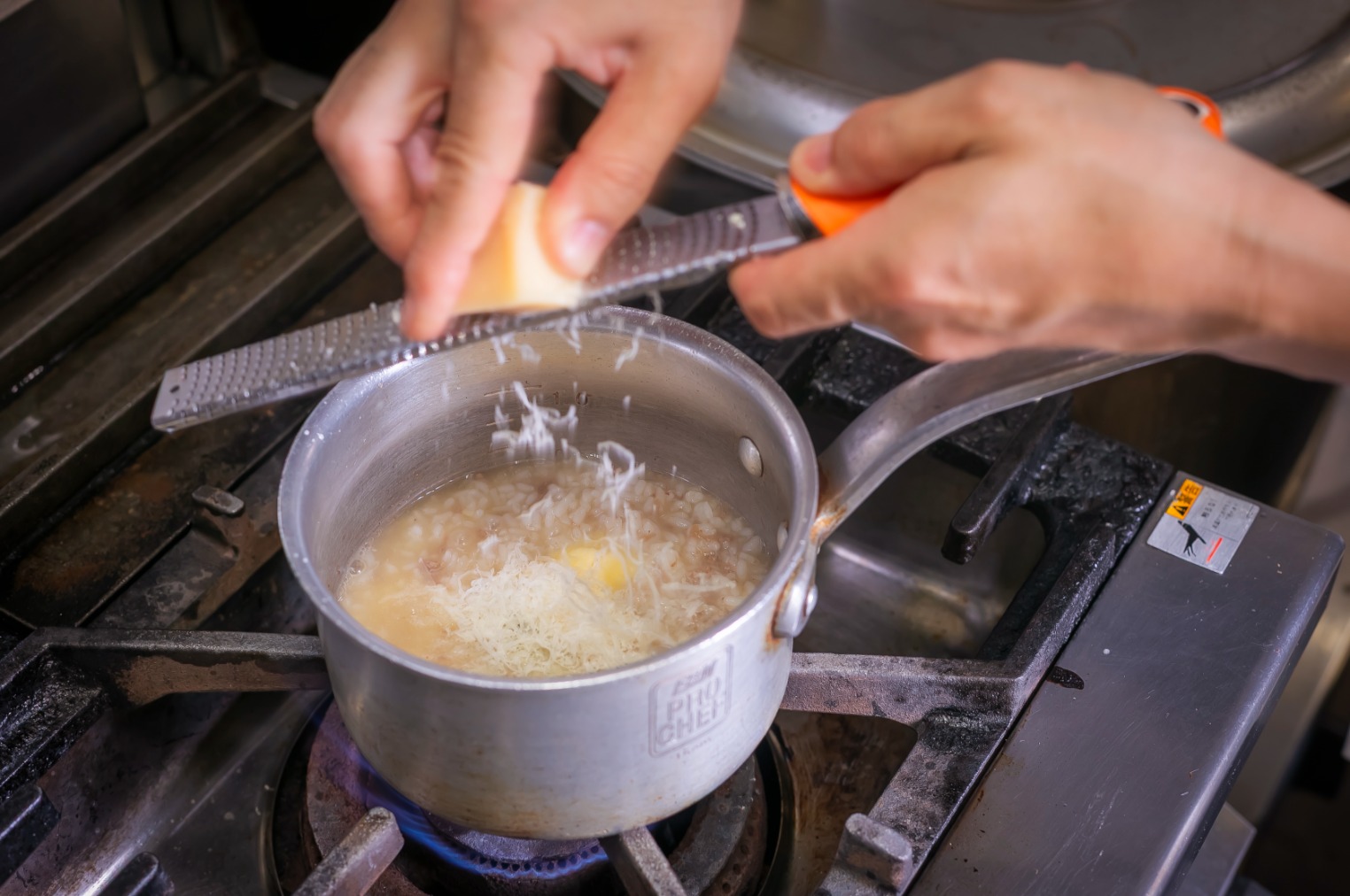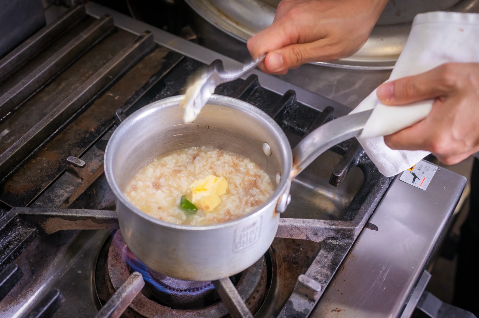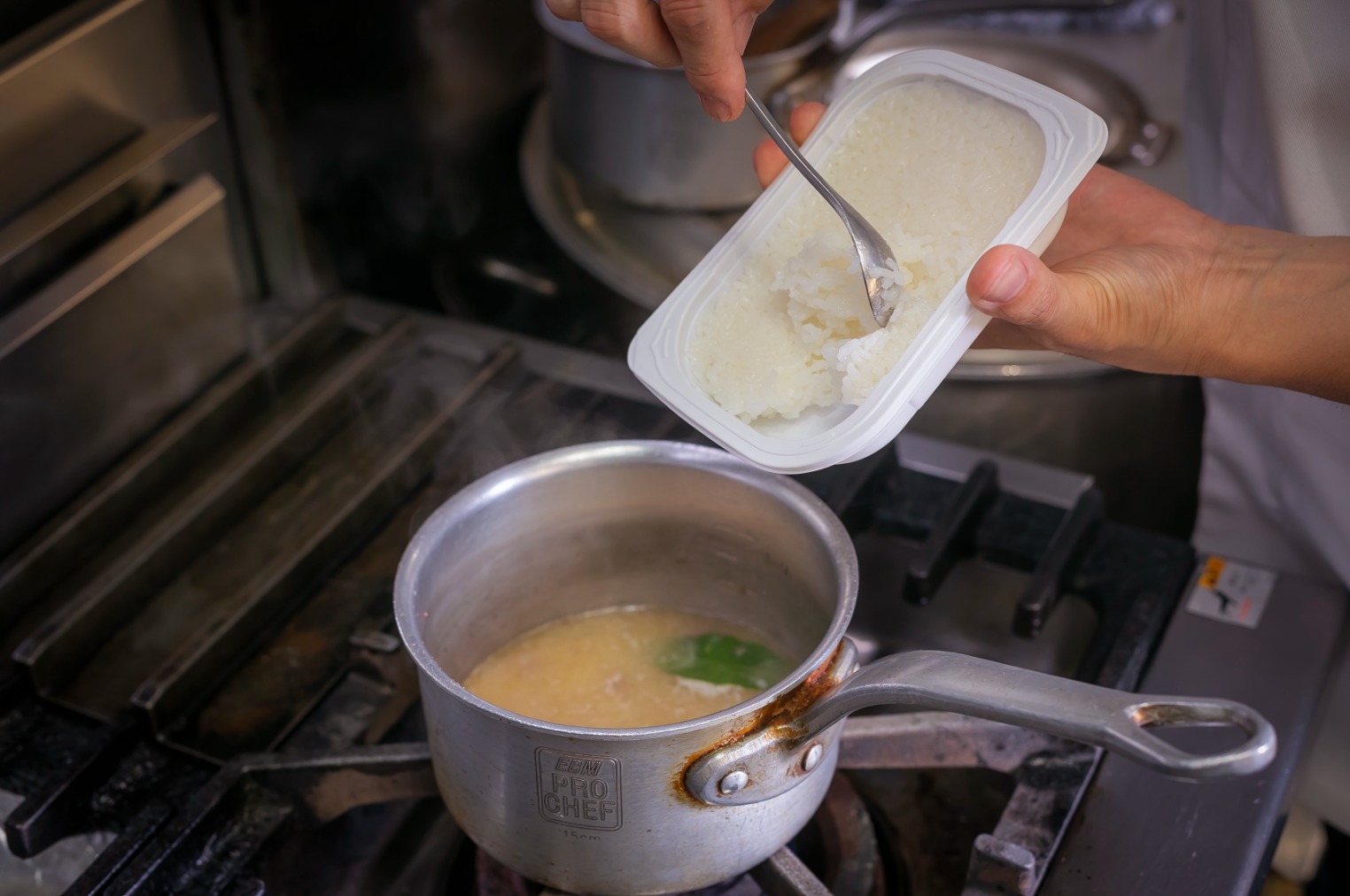 Risotto made with pre-cooked rice tends to be sticky, so it is important not to over-stir it. Dairy products lose their flavor easily when heated continuously, so for both the risotto and the sauce, turn off the heat after adding the dairy products and then stir.
