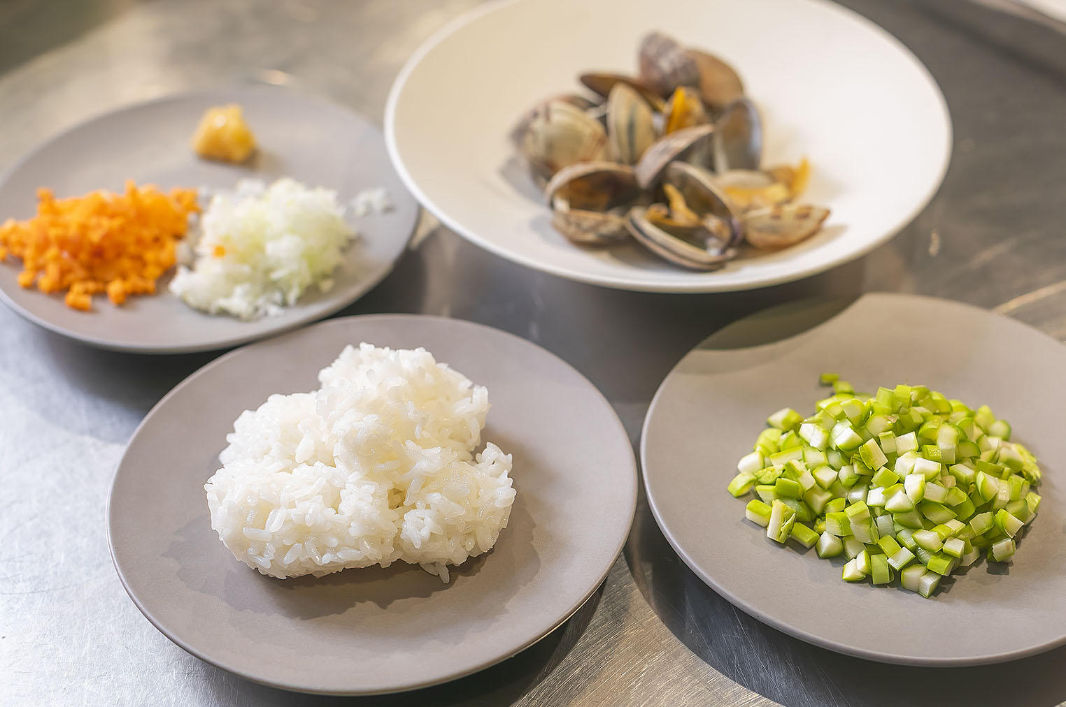 Arroz caldoso is a rice dish that originated in the Valencia region of Spain. Rice is simmered in a large amount of soup, similar to risotto and rice porridge, to create a creamy texture. Pre-cooked rice (or regularly cooked rice) is added to a soup filled with the umami of short-necked clams steamed in white wine and the sweetness of coarsely chopped vegetables. It is then simmered to create a Spanish-style rice porridge. The delicious flavor of the soup enhances the great taste of the rice. The light and refreshing taste of this masterpiece makes it perfect for a late-night snack or when you want to treat your stomach to something comforting.
