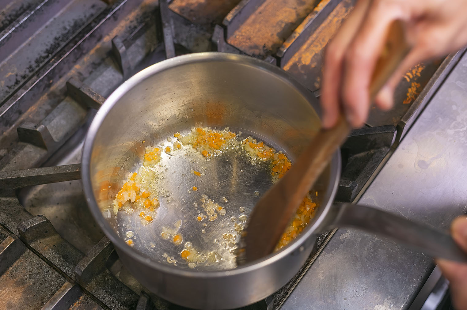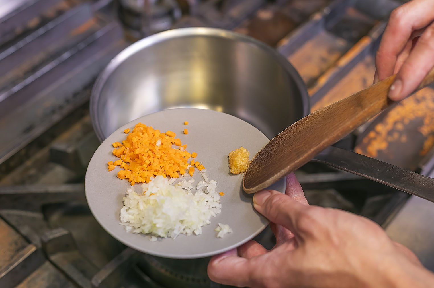 にんにく、にんじん、玉ねぎを中火で炒め、油が馴染んだら火を止める。