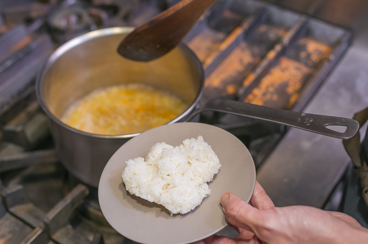 ポイントは、具材の野菜をパックごはんのお米と同じくらいに細かく切ること。野菜から出た旨味を吸いやすくなり、お米の美味しさがより引き立ちます。アサリは固くならないよう、白ワインで蒸した後、蒸し汁から取り出しておきましょう。玉ねぎ、にんにく、にんじんを炒めたら、そこに蒸し汁とブイヨンスープを入れて煮込み、パックごはんも加えます。最後にアサリとアスパラガスを入れて軽く煮込み、塩で味を整えれば完成です。