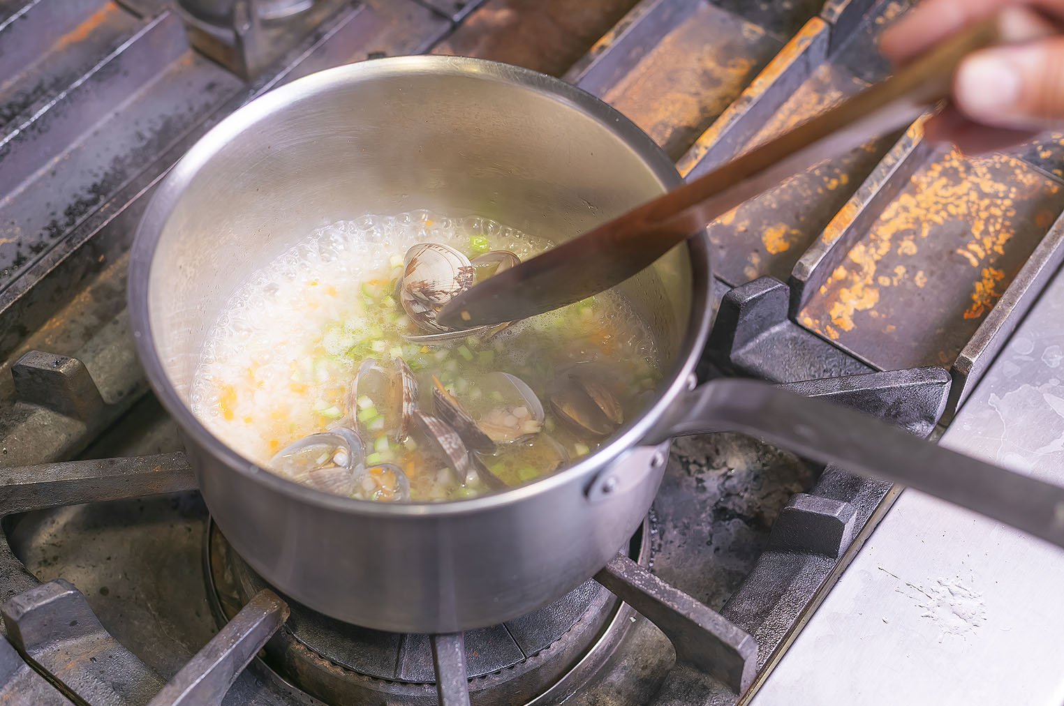 2にアサリの蒸し汁とブイヨンスープを入れて中火で加熱する。