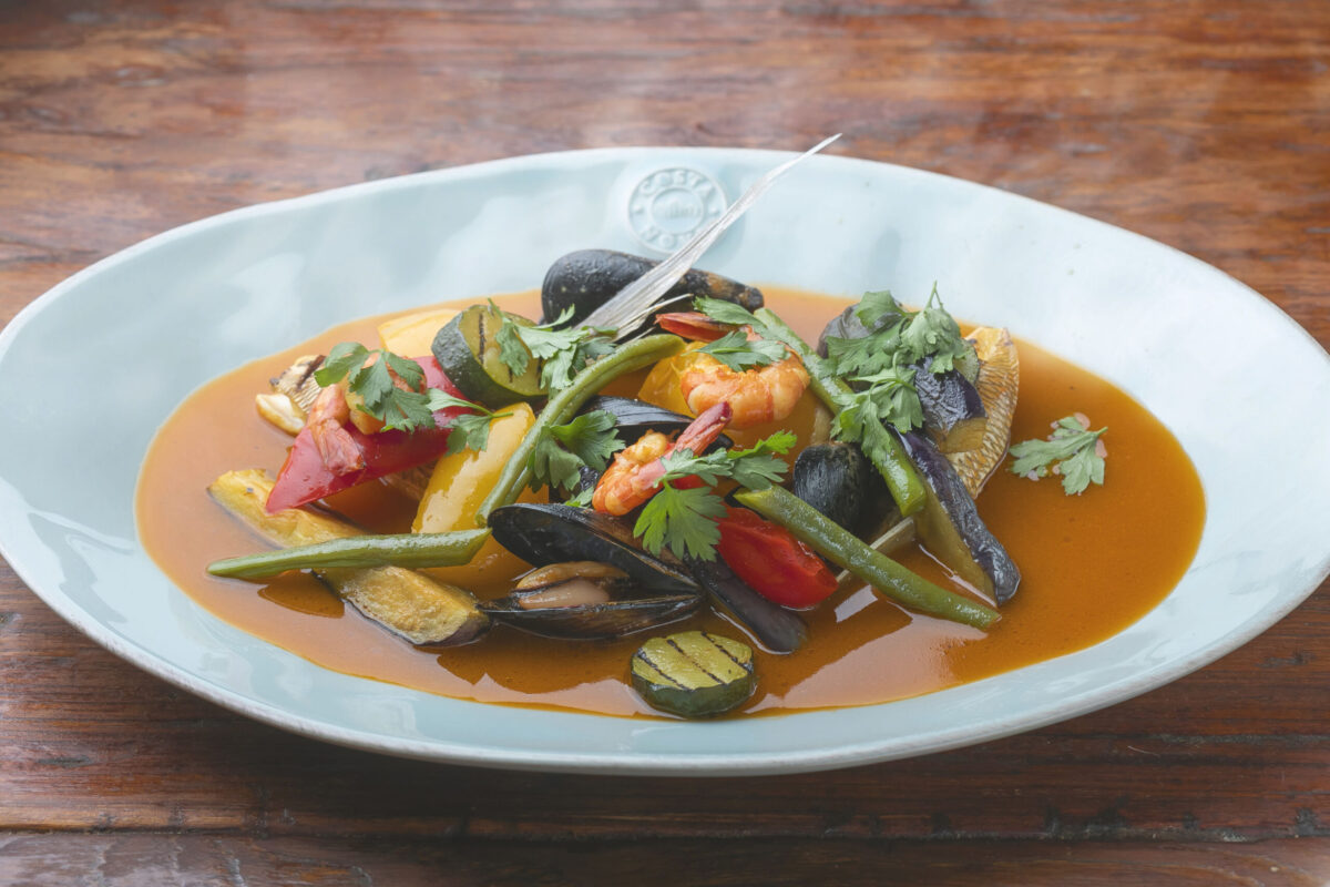 Ataを訪れる人の誰もが注文する人気メニュー。目利きの仲卸業者からその日に仕入れた真鯛のアラをたっぷりと使用して贅沢に出汁をとり、独自に調合したハーブを煮出したハーブ・ウォーターを用いて真鯛の身を焼き、旨みを引き出す。具材はそれぞれベストな食感に調理しているため、旬の野菜はほろりと口中に溶け、ムール貝はプリッとした歯応えに。真鯛とハーブの滋味深い味わいと共に、絶妙な食感も楽しめる逸品。