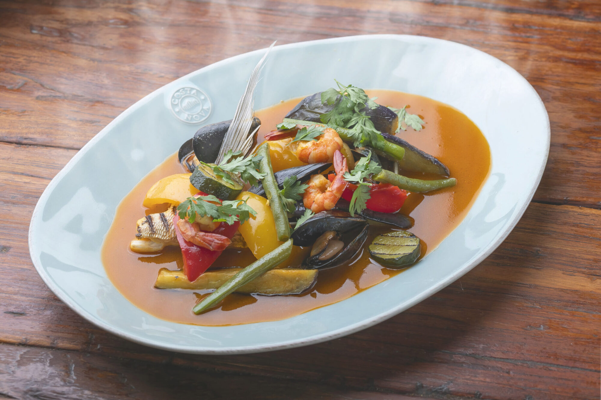 Ataを訪れる人の誰もが注文する人気メニュー。目利きの仲卸業者からその日に仕入れた真鯛のアラをたっぷりと使用して贅沢に出汁をとり、独自に調合したハーブを煮出したハーブ・ウォーターを用いて真鯛の身を焼き、旨みを引き出す。具材はそれぞれベストな食感に調理しているため、旬の野菜はほろりと口中に溶け、ムール貝はプリッとした歯応えに。真鯛とハーブの滋味深い味わいと共に、絶妙な食感も楽しめる逸品。