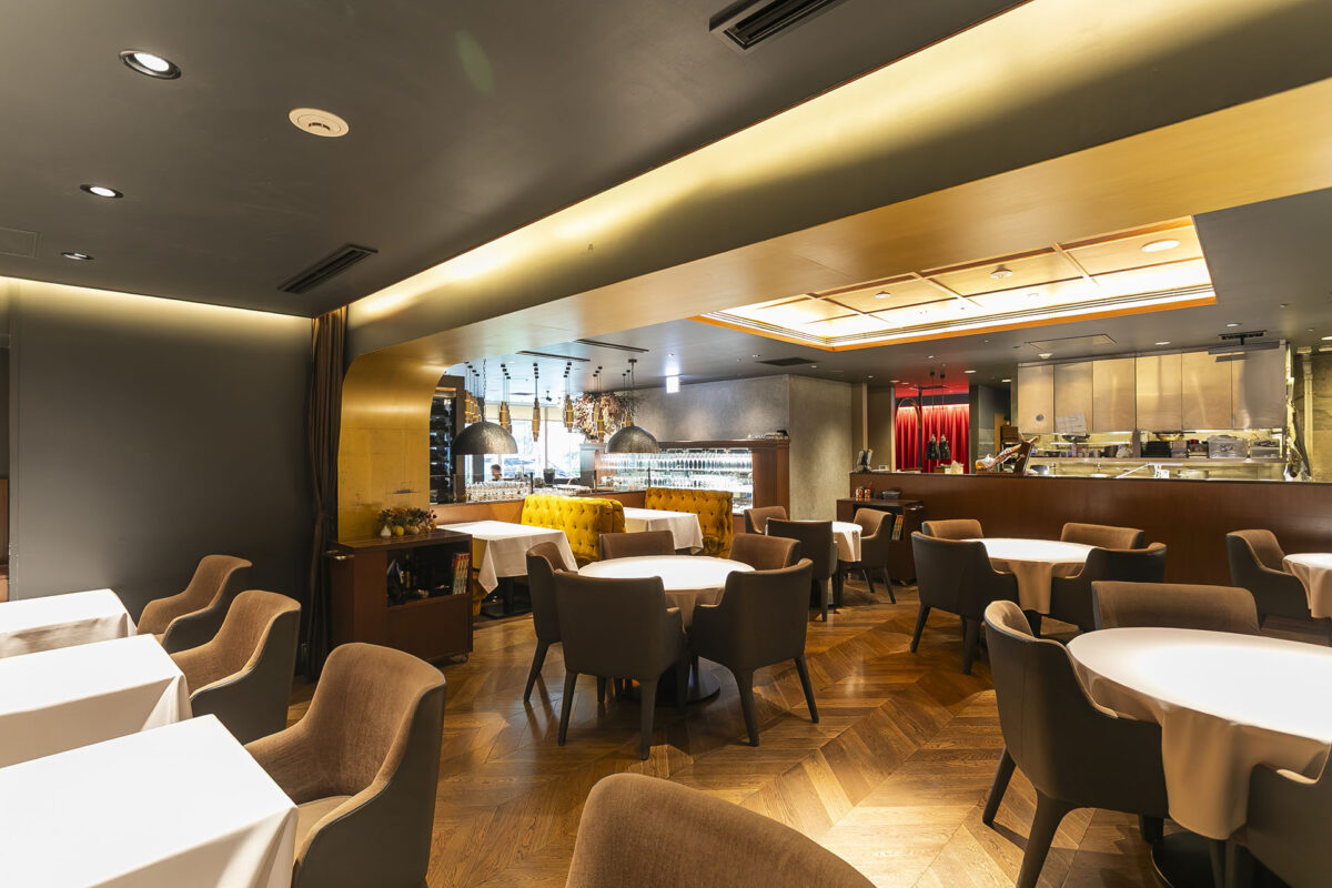 煌めくシャンデリアに照らされたハイカウンターが目を引くラグジュアリーな店内は、2つのエリアに分かれています。大きな窓から通りを望むことができるカジュアルダイニングエリア、そして、ヘリンボーンの絨毯を敷き詰めた大空間にゆったりとテーブル席を配置したハイエンド レストランエリアがあり、気軽な食事から大切な人と過ごす記念日まで、シーンに合わせた楽しみ方ができます。
