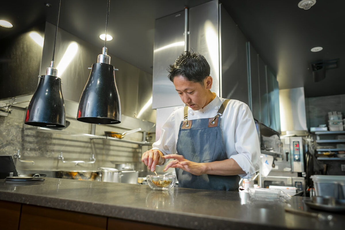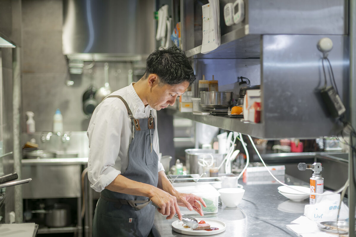 新崎さんは、オープン当初からスペイン料理担当のシェフを務めてきましたが、現在は料理長に就任。新しい食材を積極的に取り入れ、スペイン料理と中華料理の技法を用いて完成させたオリジナリティ溢れる料理には、盛り付けや食べ方まで楽しませる工夫が凝らされています。「美味しさと面白さを追求することを目指している」という新崎さんは、面白い食材や珍しい食材を日々探し、気になる食材を見つけたら産地の生産者を直接訪ねています。また、和食やフレンチなど多様なジャンルの料理人とのつながりを活かして情報交換を行い、ヨーロッパの野菜を研究する会にも参加しているうちに、社内の産地訪問研修まで手がけるようになりました」とのこと。