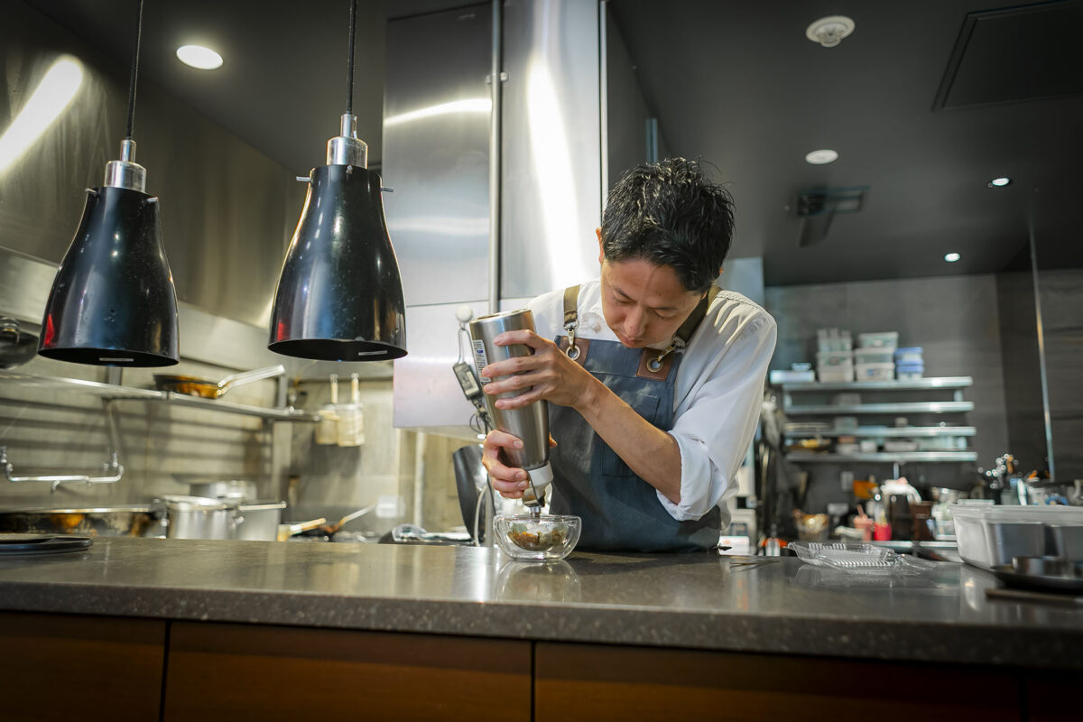 さまざまな角度からアンテナを張り、季節に合わせた面白い食材や珍しい食材を探し続けていますし、ただ美味しく料理するだけでは終わらせません。「スペイン料理と中華料理の技法を用いて、その食材をどう面白く料理し、いかに斬新なものとするのか」「どんな盛り付けなら驚きを持って楽しんでいただけるのか」を常に考え続けています。