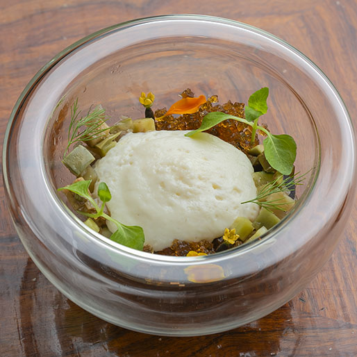 中華料理の中でも非常にシンプルで人気のある前菜「皮蛋豆腐」に、スペイン料理の手法を用いて、あえて盛り付けも洋風仕立てに。オリーブオイルとレモン汁で、細かく刻んだ水茄子、搾菜、キュウリ、ケッパーをラビゴットソース風に仕上げ、石川県産のマイクロハーブで柔らかな香りを添えた。滑らかな豆腐とシャキッとした薬味の食感が口の中で複雑なリズム感を生み出し、洋と中華の融合を見事に表現した。